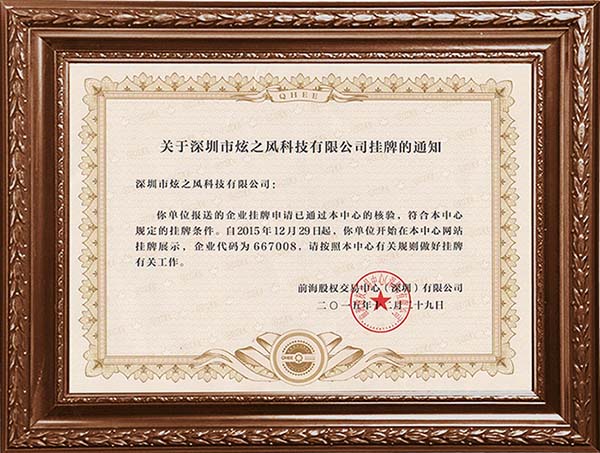 • 2015年12月29日,炫之風在前海股權交易中心掛牌成功,進駐深圳,經營三維動畫與影視宣傳片、三維動畫宣傳片及互動多媒體、展覽展示業務,開啟品牌與資本融合擴張之旅