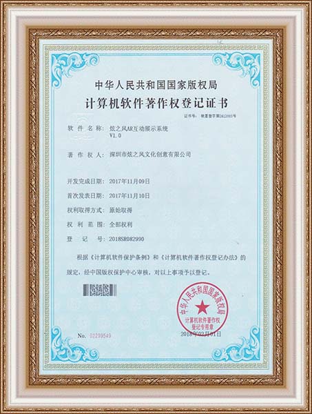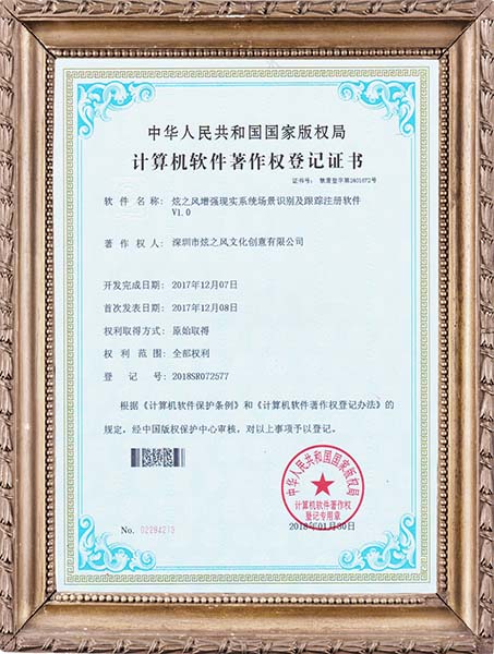 • 2017年12月07日,炫之風公司取得增強現實系統場景識別及跟蹤注冊軟件V1.0登記證書