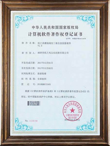 • 2017年12月01日,炫之風公司獲得增強現實三維全息投影軟件V1.0登記證書