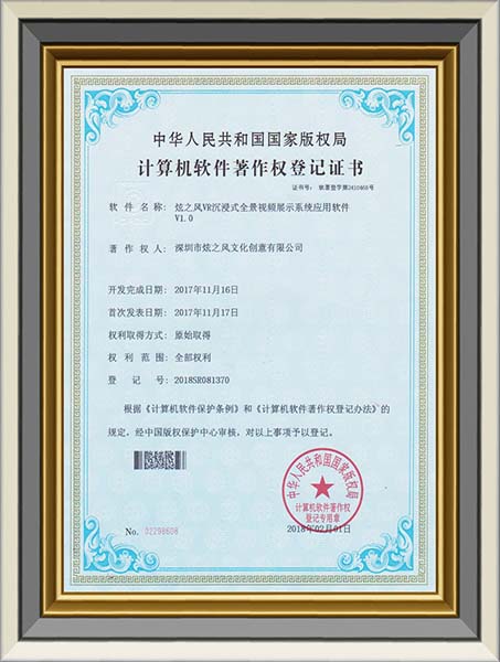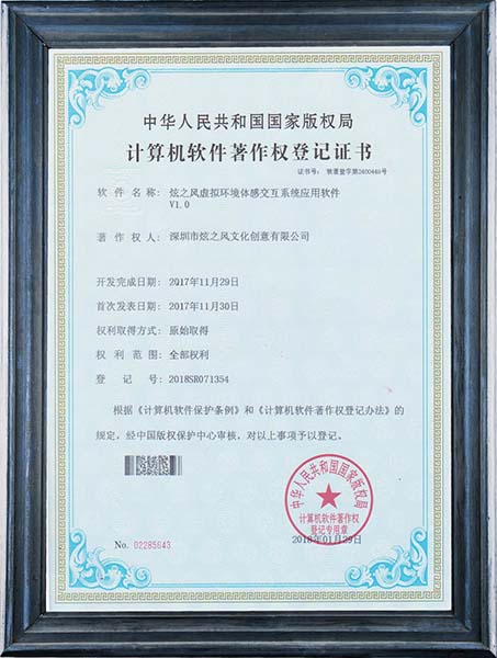 • 2018-6-26,炫之風公司獲得虛擬環境體感交互系統應用軟件V1.0登記證書