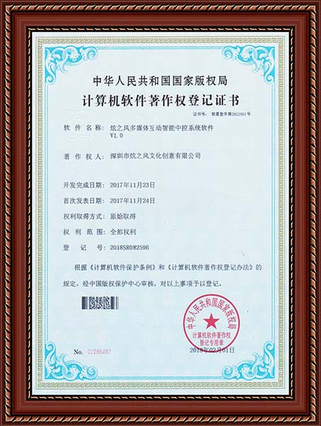 • 2017年11月23日,炫之風公司獲得多媒體互動智能中控系統軟件V1.0登記證書