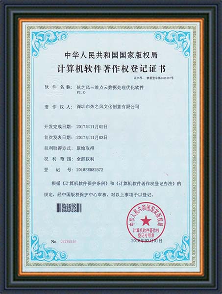 • 2017年11月02日,炫之風公司獲得三維點云微數據處理優化軟件V1.0登記證書