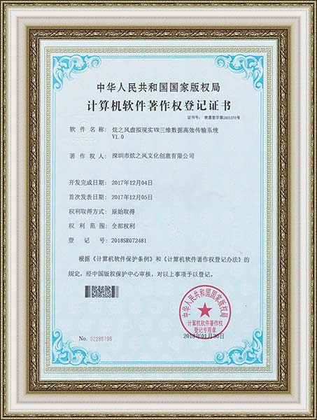• 2017年12月04日,炫之風公司獲得虛擬現實VR三維數據高效傳輸系統V1.0登記證書