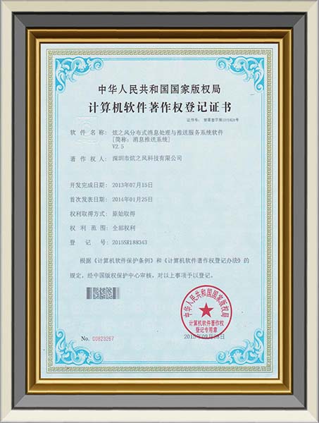 • 2014年4月5日,炫之風獲得分布式消息處理與推送服務系統軟件登記證書