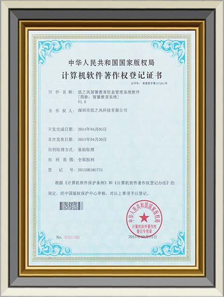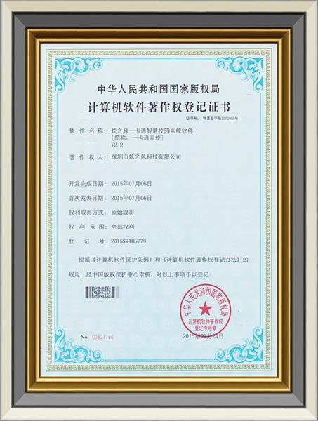 • 2015年7月6日,炫之風獲得卡通智慧校園系統軟件登記證書