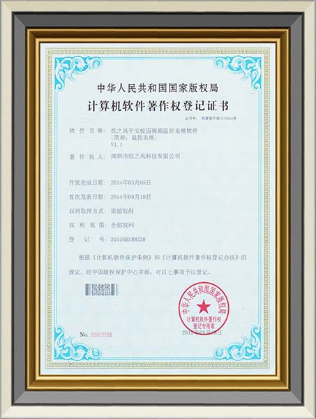 • 2014年5月5日,炫之風獲得平安校園視頻監控系統軟件登記證書