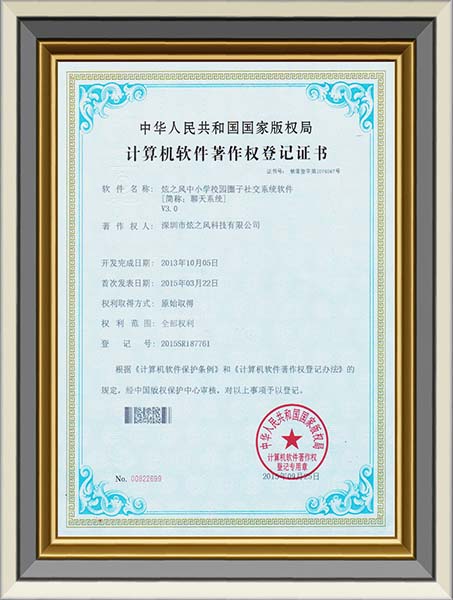 • 2013年10月5日,炫之風獲得中小學校園圈子社交系統軟件登記證書