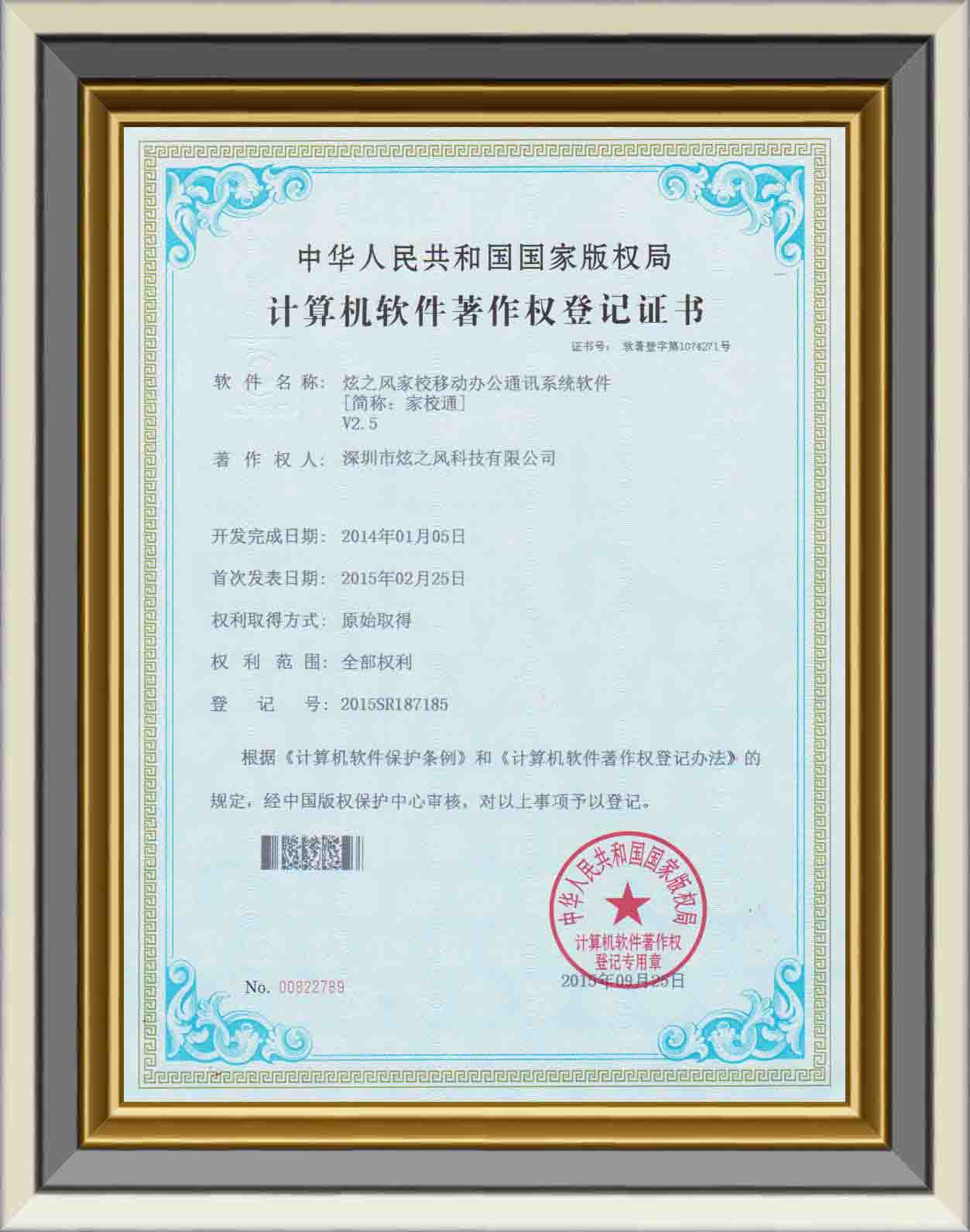 • 2014年5月1日,炫之風獲得家校移動辦公通訊系統軟件登記書