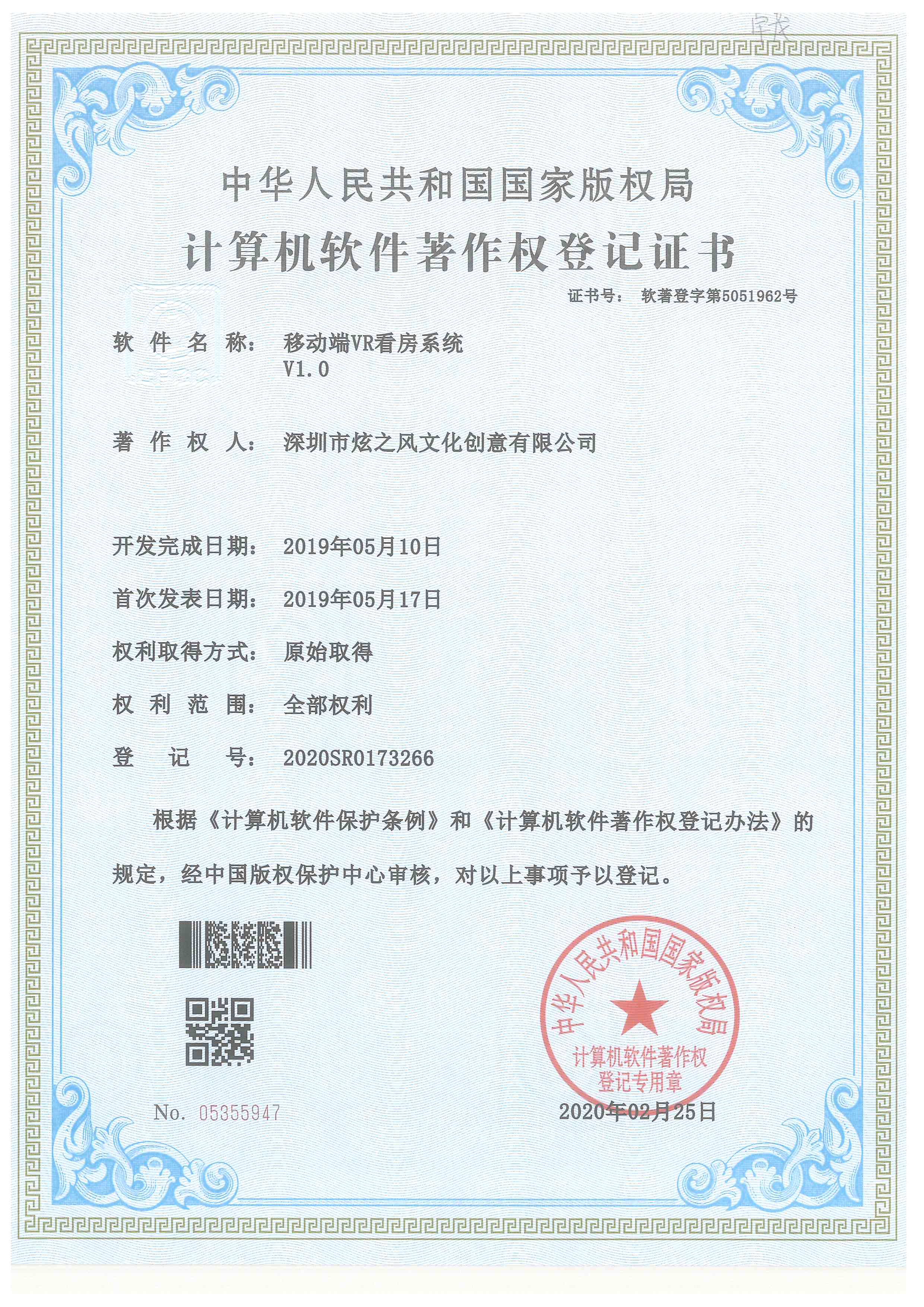 • 2020年2月25日,炫之風取得移動端VR看房系統V1.0計算機軟件著作權證書