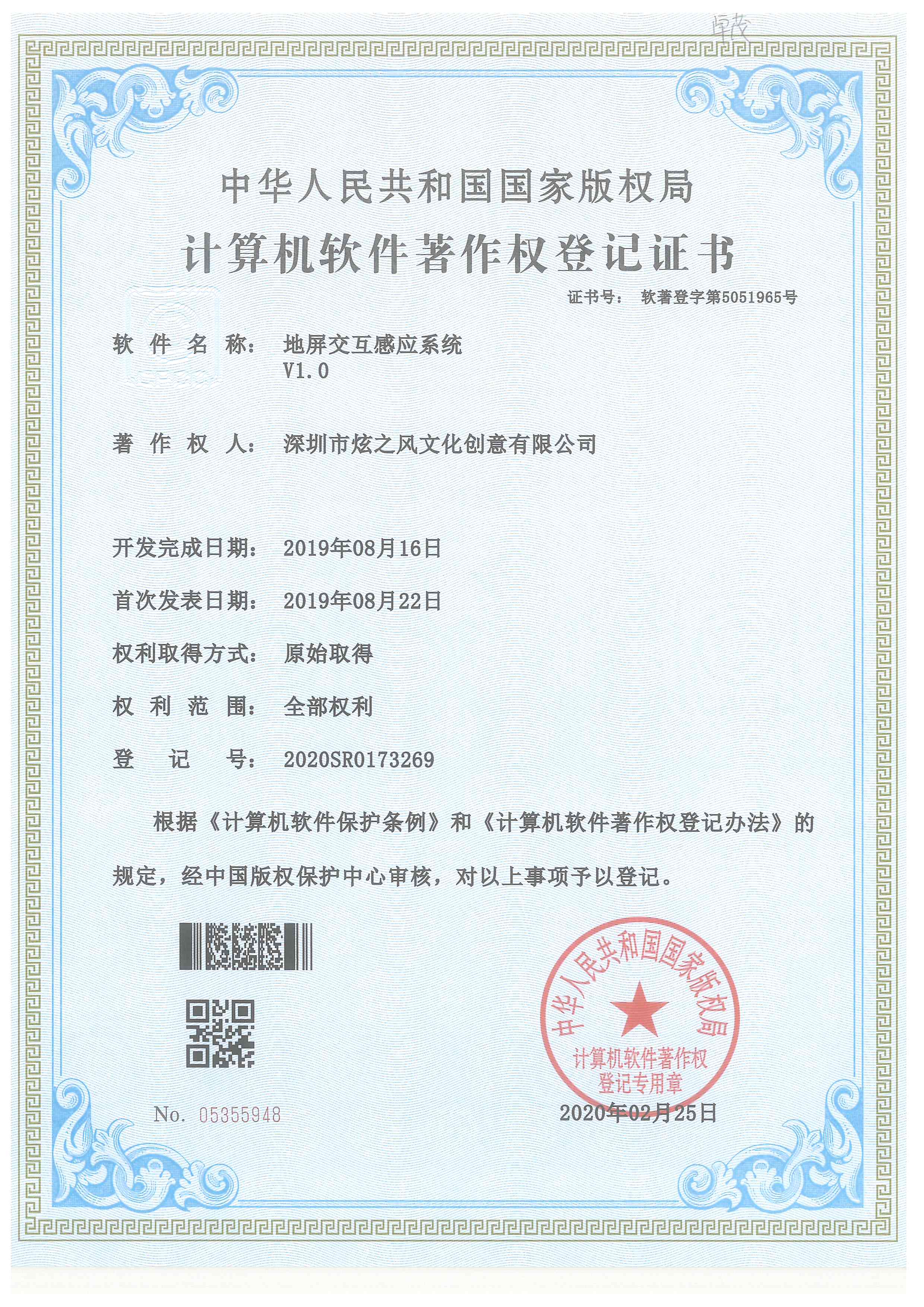 • 2020年2月25日,炫之風取得地屏交互感應系統V1.0 計算機軟件著作權證書