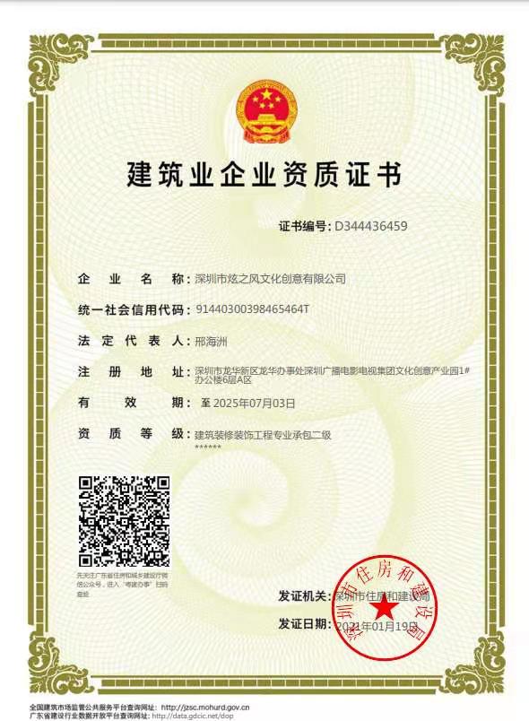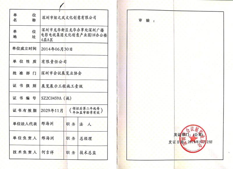 • 2019年11月25日,炫之風獲得深圳市展覽協會展覽展示工程施工壹級資質