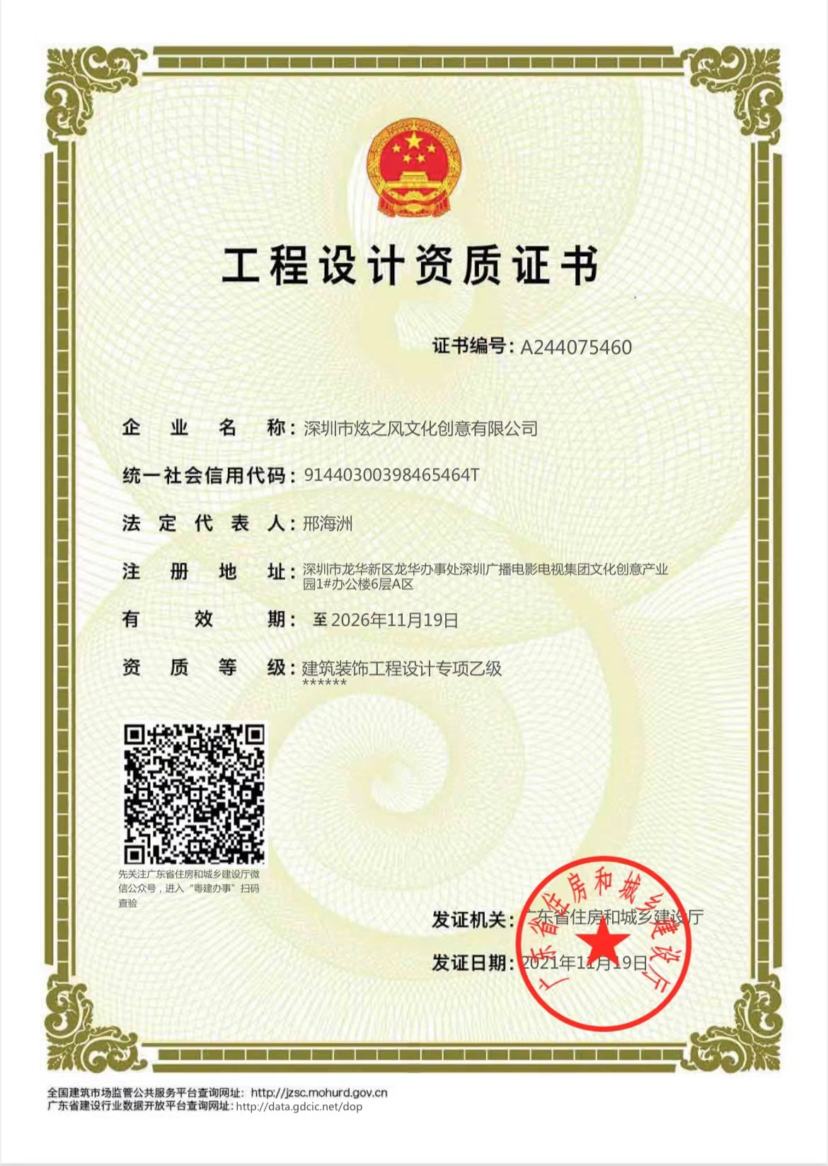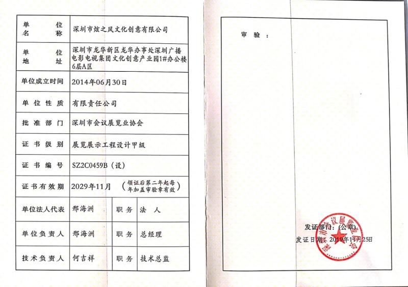 • 2019年11月25日,炫之風獲得深圳市展覽協會展覽展示工程設計甲級資質