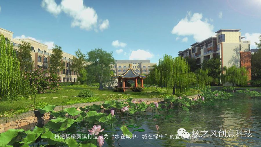 整體的風格上,炫之風選擇寫實的手法,通過對項目的研究,制作出的三維模型逼真的描繪了楊橋新鎮的整體全貌。為大家呈現了一個新農村的生長狀態,感受到那股生機勃勃的氣息。